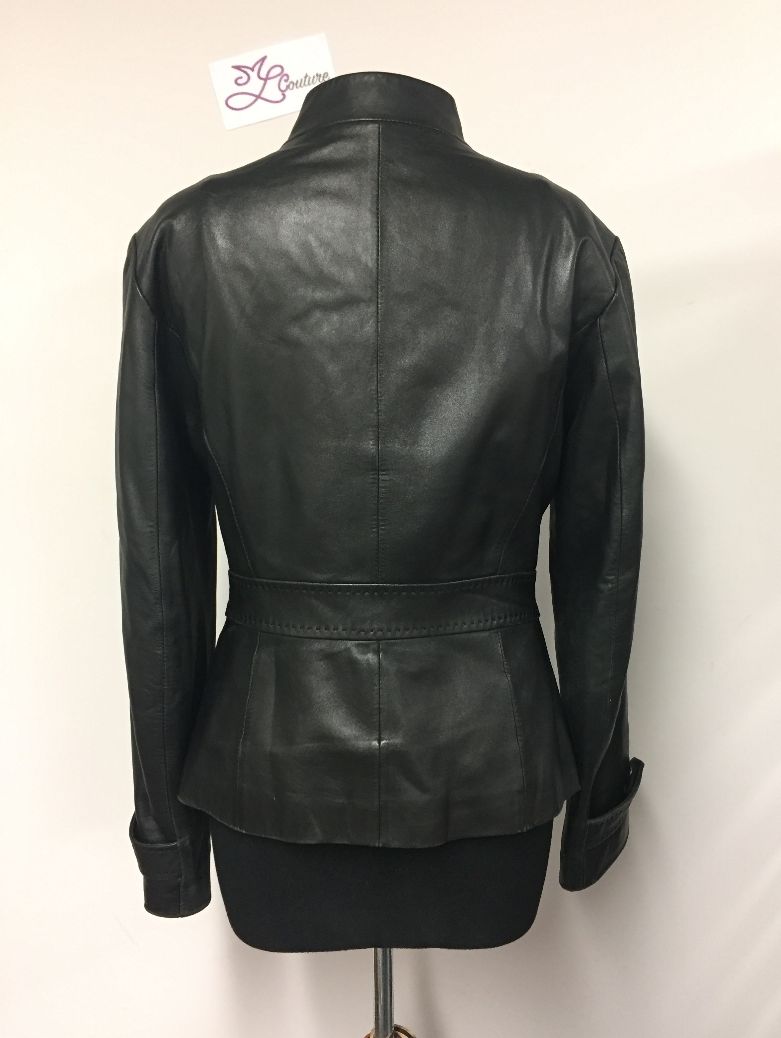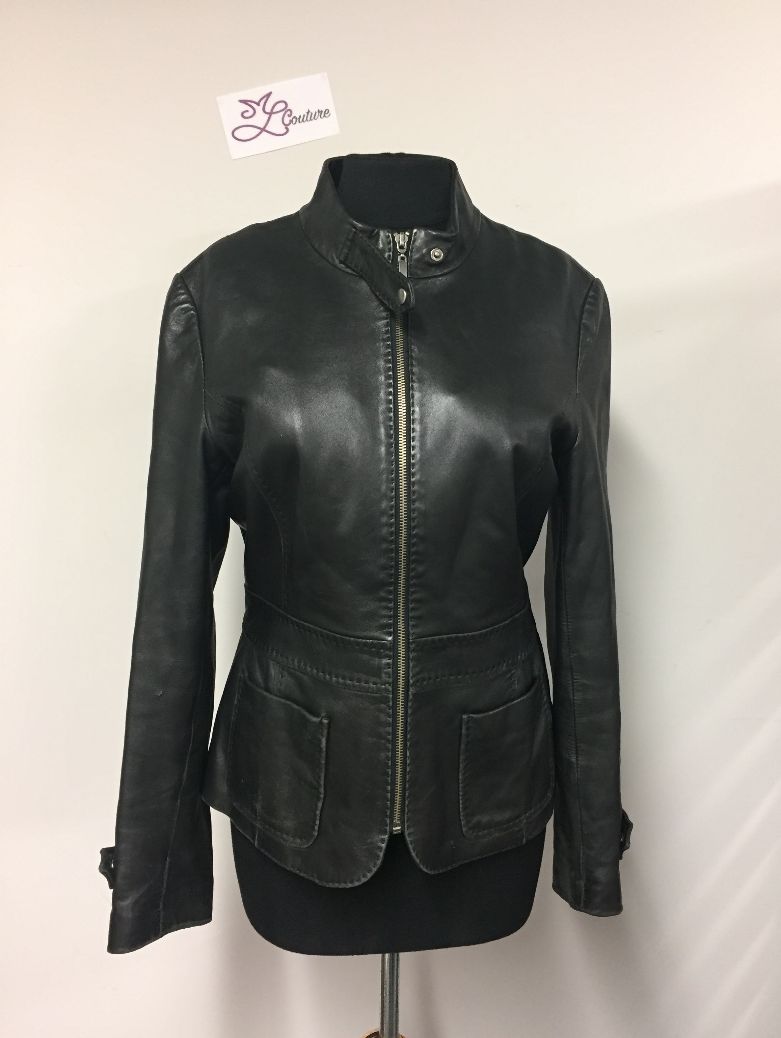 Au départ, j’ai commencé à couper ma pochette dans le dos mais le cuir était ancien, il se déchirait au niveau des coutures et je n’ai donc pas pu utiliser cette partie. J’ai donc retourné le blouson et trouvé une idée encore plus simple: j’allais faire la pochette dans le devant en réutilisant la fermeture! Comme ça, 6 coutures en moins et j’étais sur que le zip serait bien posé!!