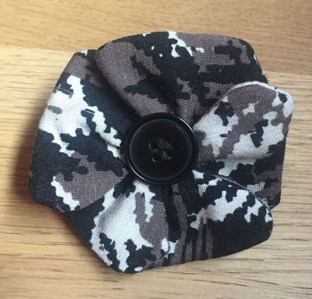 Je l’ai donc essayé avec un de mes nœuds cache-agrafe et puis j’ai eu une autre idée. Comme il me restait pas mal de chutes du tissu de ma robe, j’ai voulu en faire un assorti. Et puis pour être un peu plus original, j’ai fait une fleur plutôt qu’un nœud!