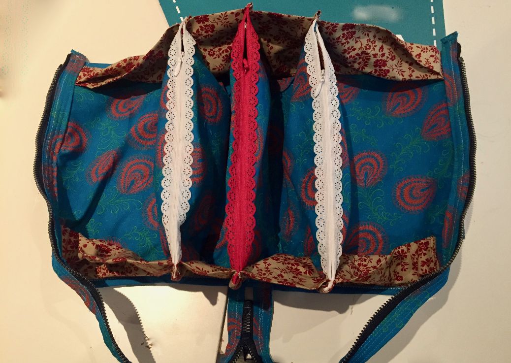 Même si j’ai déjà fait des pochettes et des sacs avec de nombreuses poches et qu’avec un peu de réflexion, j’aurais pu reproduire cette pochette sans problème, c’était très sympa d’écouter les explications et les astuces au fur et à mesure des étapes. En plus, je n’ai jamais pris de cours ou assisté à des ateliers couture et c’était vraiment top!