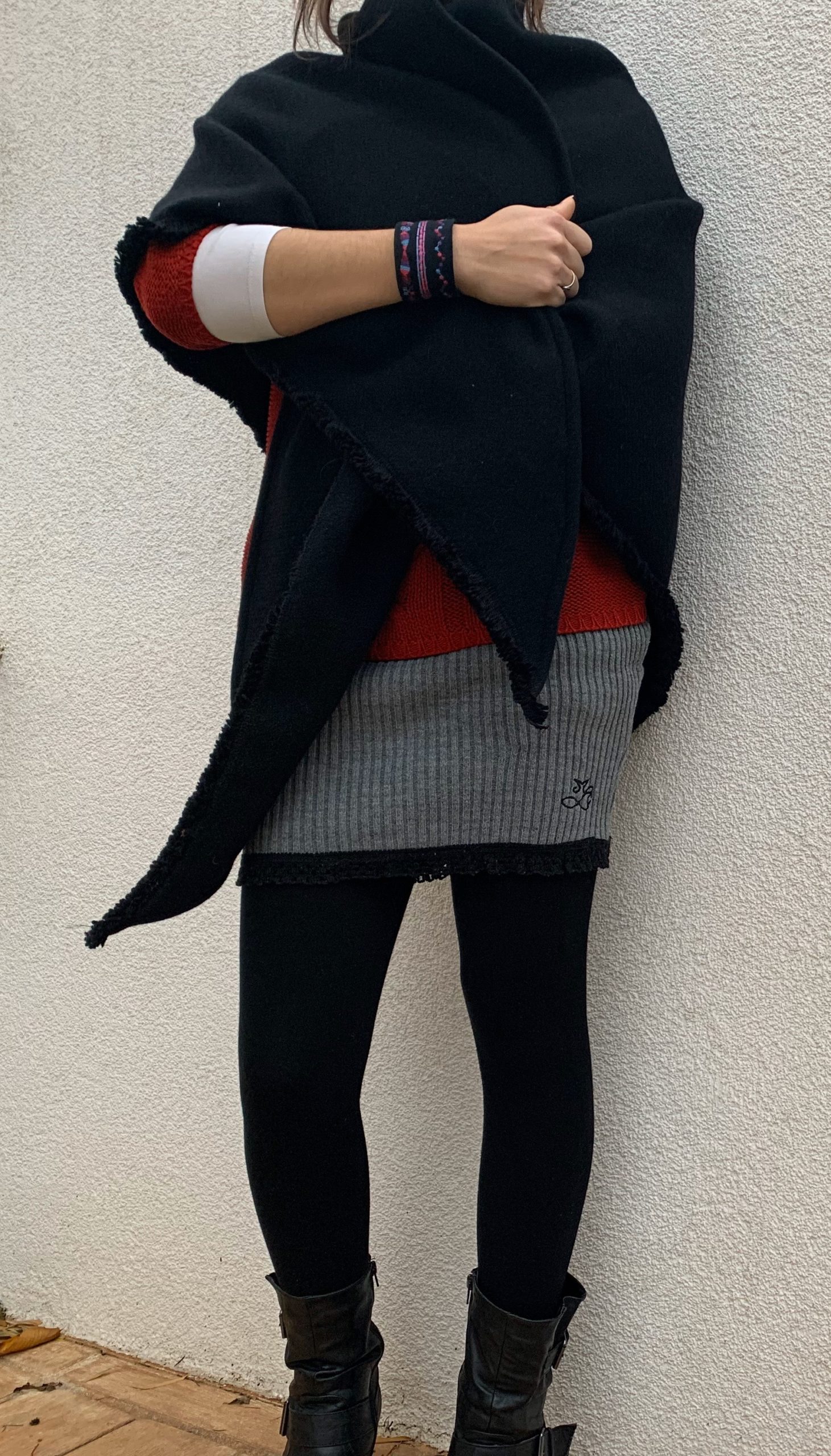 Sur la photo, je porte mon bracelet cousu et ma jupe d’hiver que j’ai fais il y a 5 ans déjà mais que j’aime toujours autant.