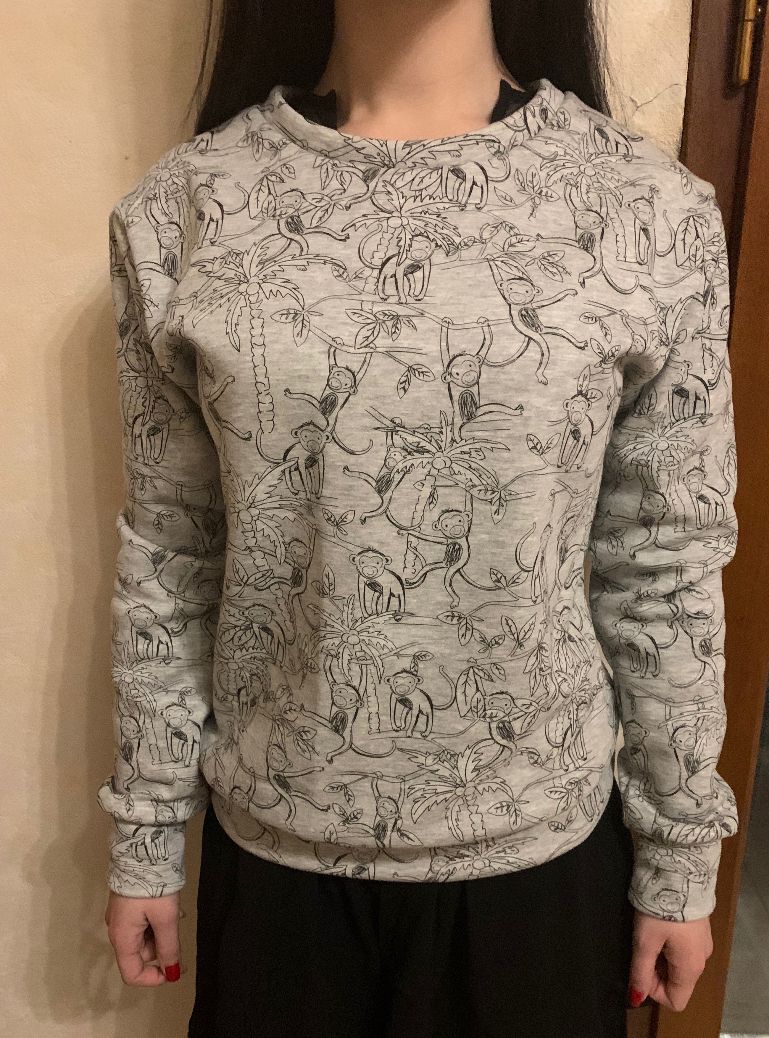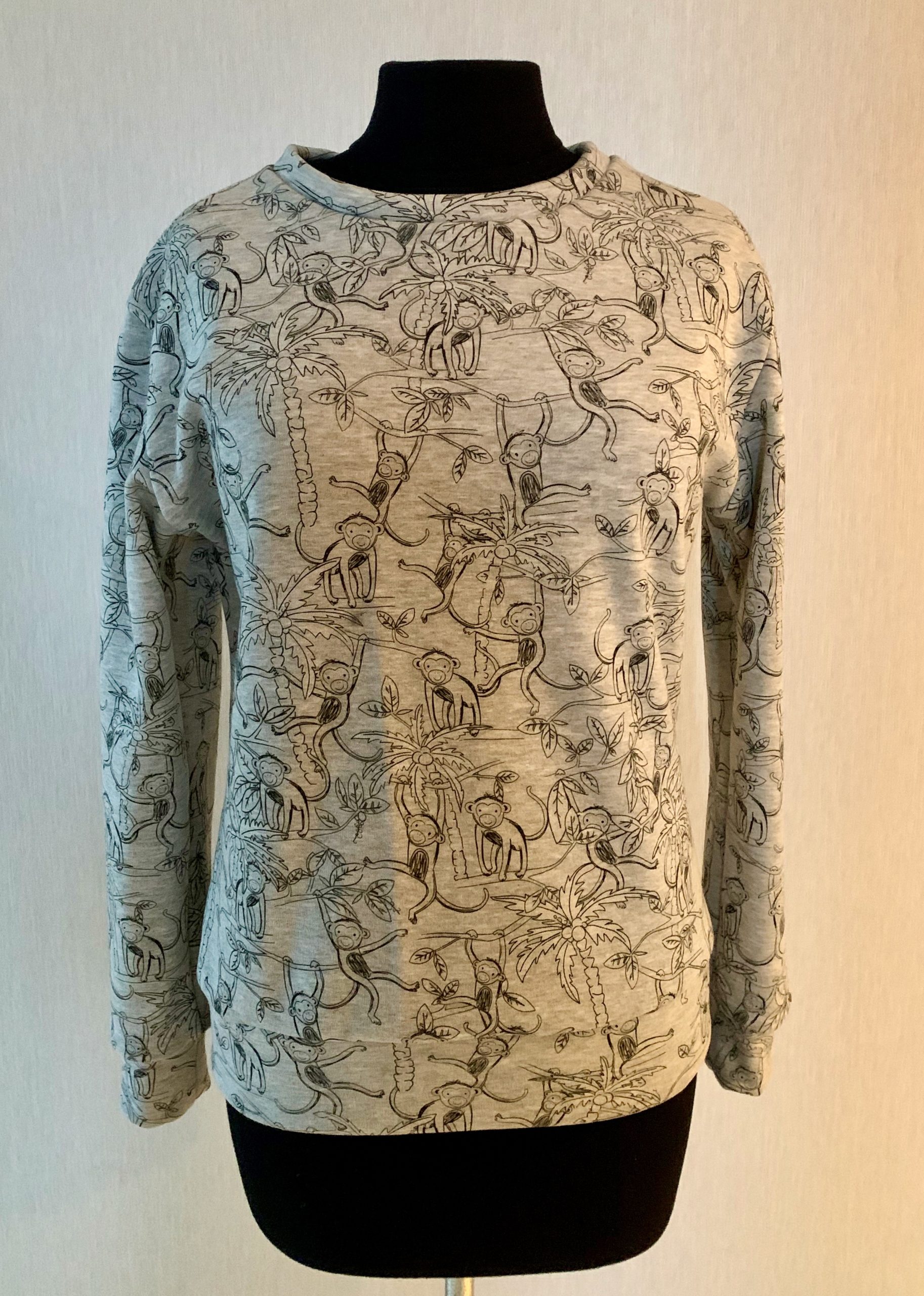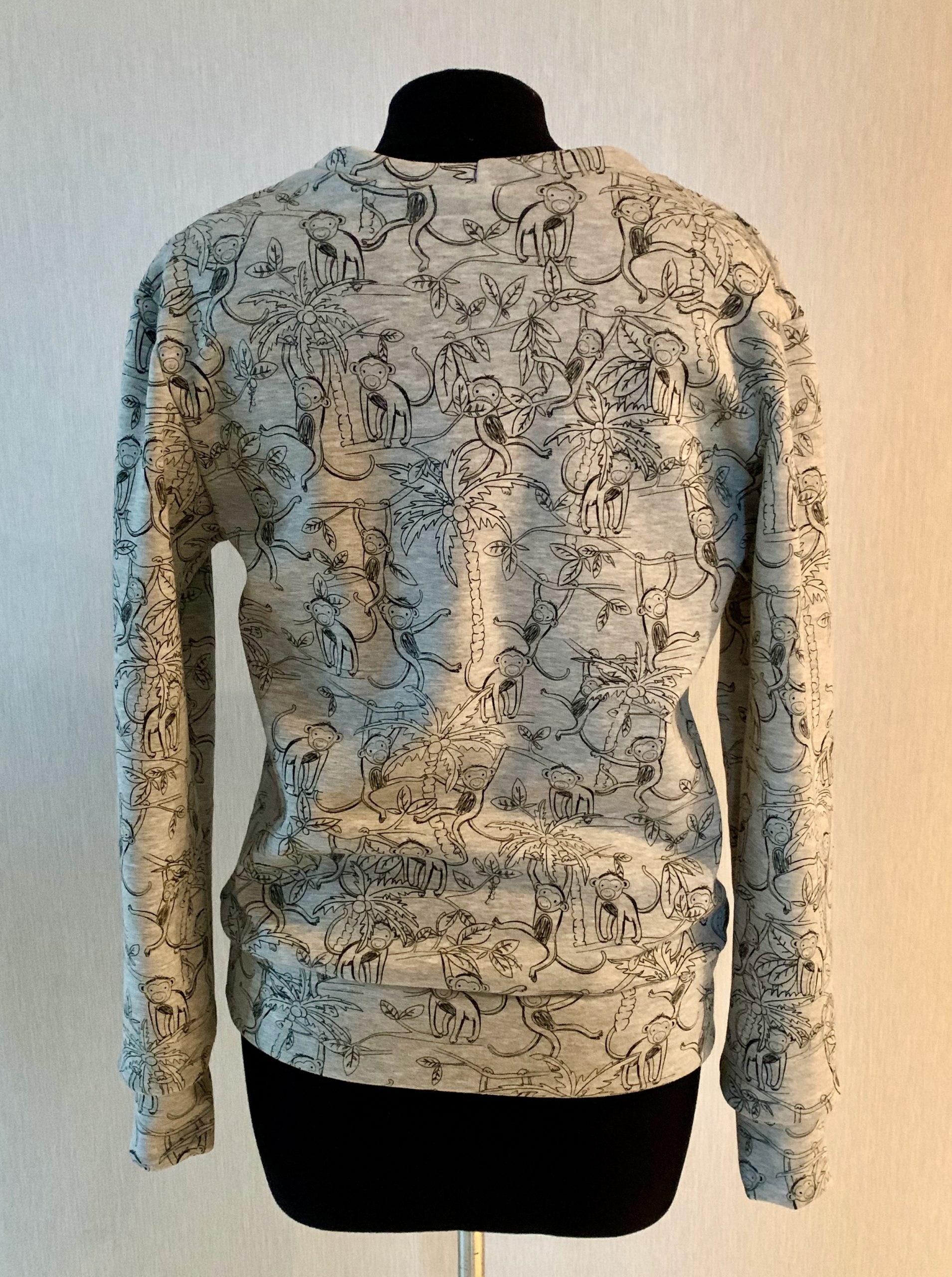 Malheureusement, il faisait déjà nuit quand je lui l’ai offert et elle n’a pas encore trouvé un moment pour faire une photo au soleil donc je n’ai pas de photos du sweat avec les changements de couleurs. J’ai quand même mis un bout de chutes qui me restait dehors dès qu’il a fait soleil pour voir le rendu. C’est difficile à prendre en photo mais les singes deviennent marron, les feuilles jaunes et les troncs bleus.